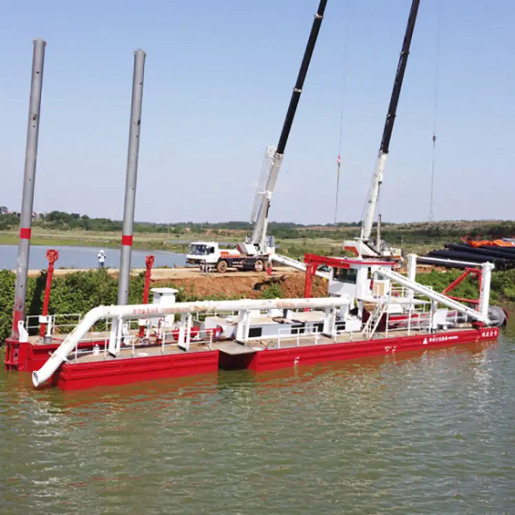 Nasza firmowa pogłębiarka ssąca do piasku rzecznego z silnikiem wysokoprężnym Cumins jest samobieżną lub niesamobieżną, przenośną pogłębiarką ssącą do piasku rzecznego z silnikiem wysokoprężnym Cumins. Kadłub ma konstrukcję demontowalną i skrzynkową, a jego rodzaj demontażu można łatwo zmontować w miejscu pracy i transportować odpowiednio transportem drogowym, kolejowym i kontenerowym, wygodnym w montażu i przemieszczaniu miejsca pracy z jednego do drugiego. Układ napędowy może być dostosowany do układu elektrycznego lub układu napędowego silnika wysokoprężnego, zgodnie z wymaganiami klienta. Wyposażenie pogłębiarki ssącej do piasku rzecznego z silnikiem wysokoprężnym Cumins to miech: urządzenie przemieszczające, urządzenie podnoszące drabinę tnącą, spudzie i dźwig pokładowy.