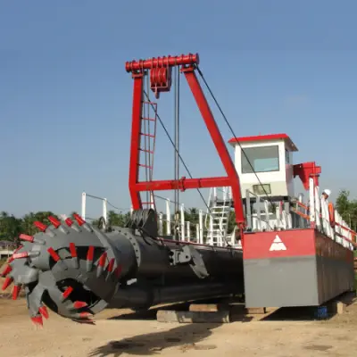 Pogłębiarka głowicowa do pogłębiania piasku Small River to mała, sterowana hydraulicznie, zmontowana pogłębiarka ssąca do cięcia rzek. Służy do pogłębiania kanałów rzecznych, pogłębiania kanałów i zbiorników wodnych. Korpus pogłębiarki ma konstrukcję demontowalną i skrzynkową. Jej rodzaj demontażu można łatwo zmontować w miejscu pracy i transportować odpowiednio drogą, koleją i kontenerem, wygodny w montażu i przemieszczaniu miejsca pracy z jednego do drugiego. Układ napędowy może być dostosowany do układu elektrycznego lub układu napędowego silnika wysokoprężnego, zgodnie z wymaganiami klienta. Wyposażenie pogłębiarek z głowicą do pogłębiania małych rzek to miechy: urządzenie trawersujące, urządzenie podnoszące drabinę tnącą, spednie i dźwig pokładowy. Proces roboczy jest następujący: głowica tnąca przecina piasek i błoto pod wodą do mieszaniny szlamu, a następnie poprzez pompę pogłębiającą do rurociągu na małej pogłębiarce do pogłębiania rzeki; na koniec gnojowica zostanie zrzucona rurociągiem na ląd do wymaganego miejsca.